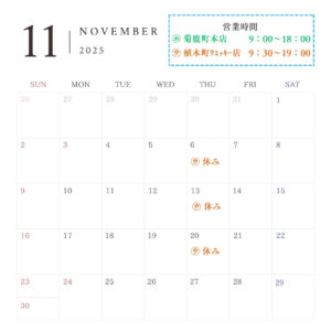 2025/10/28に投稿 投稿者 expectation 店休日のお知らせ(10月21日~11月20日まで) 店休日のお知らせ(10月21日~11月20日まで) WECKY支店(植木町)は、基本毎週木曜日となっております。 尚、諸事情により急な変更もございます。ご理解いただけますと幸いです。 菊鹿町本店につきましては、11月20日までの店休日はございません。 ★20日以降は、わかり次第にお知らせいたします。 今後の本店の店休日について、週1回の店休日を計画する予定です。(開始日はまだ未定です) 投稿ナビゲーション過去の投稿: 9月21日~10月20日までの店休日について