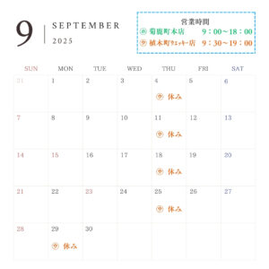 9月店休日のお知らせ(20日まで)
